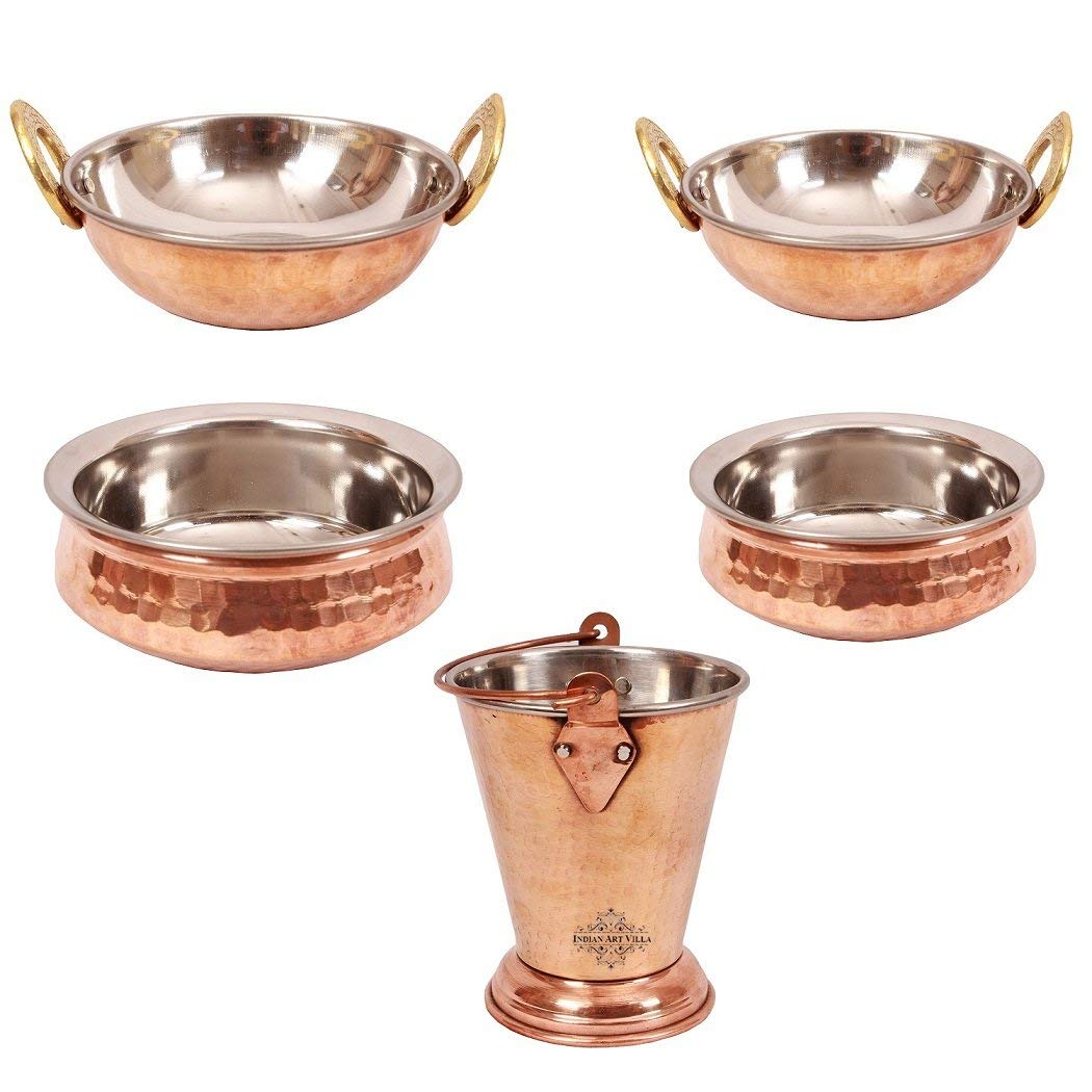 3) Indian art villa steel copper bucket balti, 2 handi bowl, 2 kadai, serveware& tableware set, the pack of 5